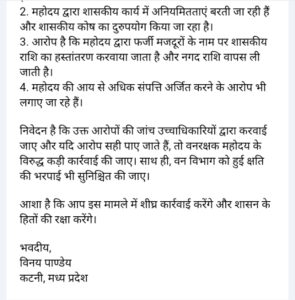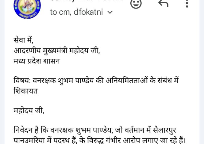 है। जनमानस ने मांग की वनरक्षक शुभम पाण्डेय की अनियमितताओं के संबंध में शिकायत की गई है। इसमें आरोप लगाया गया है कि वनरक्षक महोदय अपनी ड्यूटी से अनुपस्थित रहते हुए भी शासकीय तनख्वाह ले रहे हैं। वो शासकीय तिलक कालेज के पीछे वातानुकूलित महल में आराम करते हैं इसके अलावा, उन पर शासकीय कार्य में अनियमितताएं बरतने, शासकीय कोष का दुरुपयोग करने, फर्जी मजदूरों के नाम पर शासकीय राशि का हस्तांतरण करवाने और आय से अधिक संपत्ति अर्जित करने के आरोप भी लगाए गए हैं। पत्र में इन आरोपों की जांच उच्चाधिकारियों द्वारा करवाने और यदि आरोप सही पाए जाते हैं, तो वनरक्षक शुभम पाण्डेय को के विरुद्ध कड़ी कार्रवाई करने की मांग की गई है।