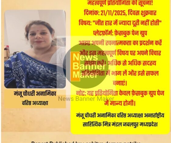 दिनांक 21 नवम्बर 2025 शुक्रवार को फेसबुक पेज पर साप्ताहिक प्रतियोगिता आयोजित हो रही है।
