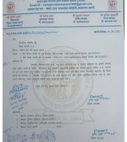 कटनी :संघ के जिलाध्यक्ष पूर्णेश उइके एवं मीडिया प्रभारी अनिल पांडेय ने प्रेस विज्ञप्ति जारी कर बताया कि संघ के प्रांतीय आवाहन पर प्रदेश स्तर पर ज्ञापन कार्यक्रम दिनांक 12 दिसंबर 2025 को आयोजित किया गया है जिसमें संघ जिला शाखा कटनी के द्वारा 15 सूत्रीय मांगों के निराकरण हेतु माननीय मुख्यमंत्री जी एवं श्रीमान मुख्य सचिव मध्य प्रदेश शासन के नाम का ज्ञापन माननीय महापौर श्रीमती प्रीति सूरी कटनी के माध्यम से समय 04 बजे सौंपा जाएगा जिसमें समस्त सदस्य ज्यादा से ज्यादा संख्या में शामिल होने हेतु संघ के पदाधिकारी अजय गौतम मनोज श्रीवास मनोज दहिया राकेश जसूजा धर्मेंद्र राज नीलेश पौराणिक हरीश बेन अजीमुद्दीन शाह बाबूलाल अहिरवार शत्रुघन ज्ञानेंद्र कमलेश सदानंद रामनरेश यादव रामावतार तेजभान हमीद खान आशीष पटेल शकुन उसरेठे रत्ना ठाकुर नकुल यादव महेश अहीरवाल सतीश पटेल अमृत लाल बलराम सिंह प्रभु द्विवेदी राजेश विश्वकर्मा एवं सदस्यों जितेंद्र सुजीत नरेश राठौर सोहन दहिया उमेश सेन रामलोचन बालकदास उमेश पुरी उमेश यादव राहुल संदीप आशा संतोष धुर्वे चंद्रमोहन ललिता खुशबू उषा रीना शोभा रजनी सपना साधना नीलम श्रुति रुचि विश्वकर्मा विपिन नीरज सत्यव्रत शुकुल मनोज अभिषेक सुशील यादव सत्येंद्र सुदामा बसंत पाण्डे कपिल विजय सिंह अनोद यादव सुरजीत सिंह मथुरा सरमन महेंद्र साहू अर्पण अवतार विक्रम चंद्रभान मेहरा अन्य समस्त सदस्यों ने ज्ञापन कार्यक्रम में शामिल होकर अपनी एकता का परिचय देते हुए शासन प्रशासन को संगठन की शक्ति का अहसास कराने हेतु अपील की है