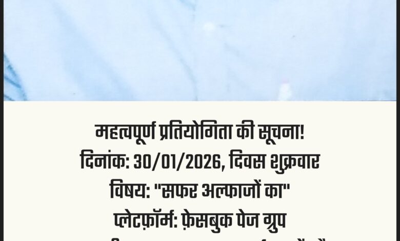 – प्रतियोगिता की समय सीमा 30 जनवरी 2026, शुक्रवार को सुबह 8:00 बजे से शाम 6:00 बजे तक है।सम्मान पत्र: सभी प्रतिभागियों को सम्मान पत्र प्रदान किए जाएंगे, जिन्हें वे फेसबुक पर स्वयं डाउनलोड कर सकते हैं।