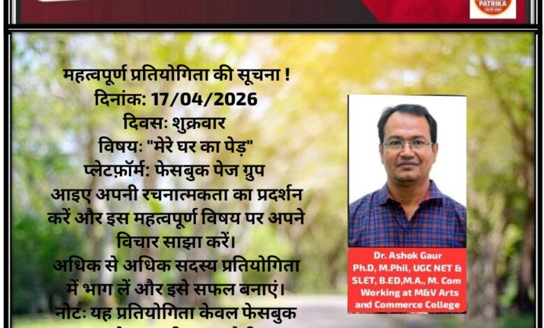 दिनांक १७ अप्रैल २०२६ शुक्रवार को फेसबुक पर प्रतियोगिता आयोजित हो रही है।